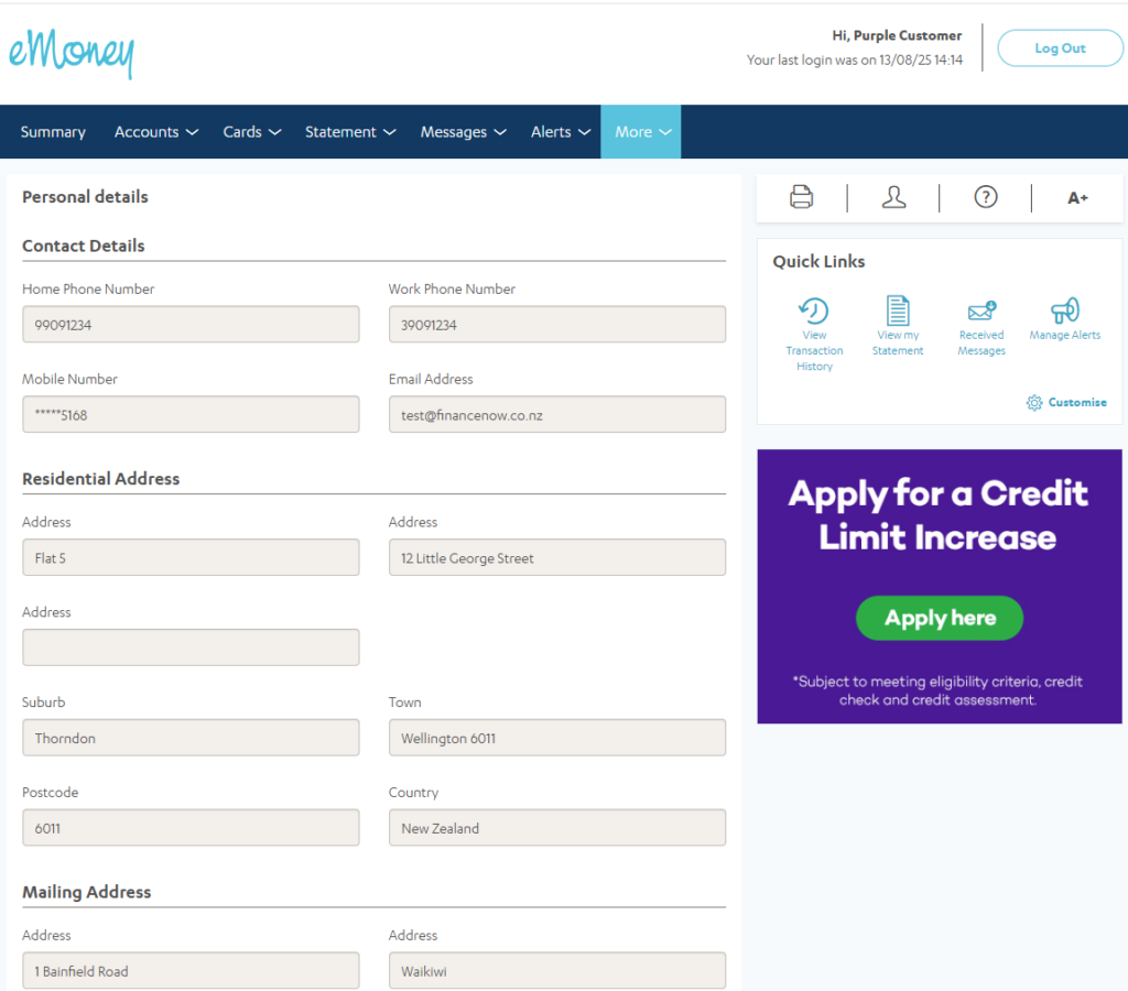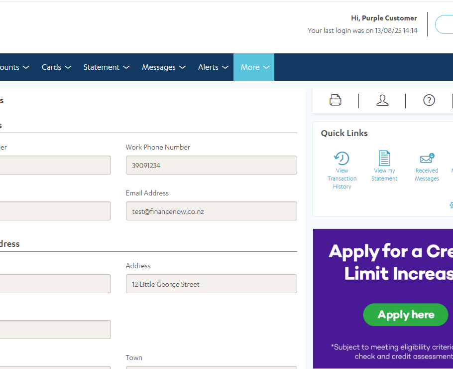 Just ensure your mailing address is up to date by logging in to eMoney.co.nz for Purple Visa Card. If it is your first time logging in to eMoney, click ‘First time login’ and follow the prompts.